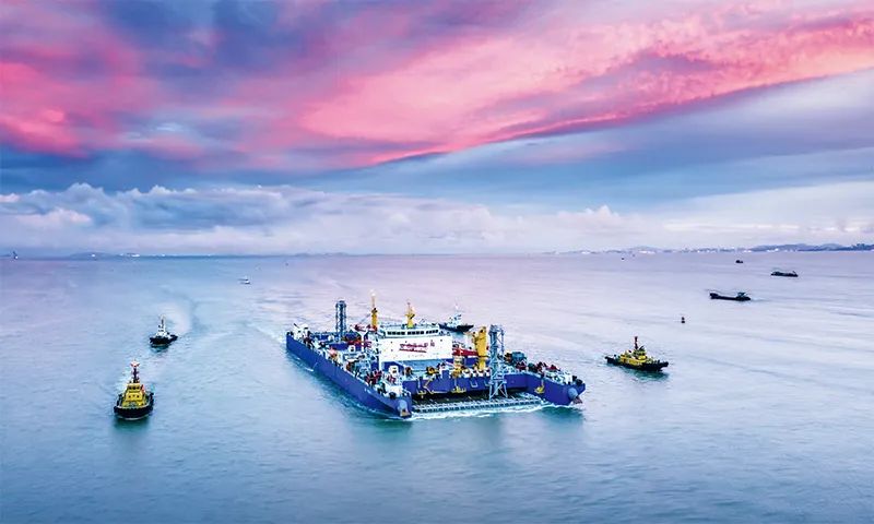 2023年6月11日,由中交一航局第二工程有限公司參與施工的國家重大工程深中通道海底沉管隧道最終接頭合龍。圖為2023年6月8日,“一航津安1”號沉管運輸安裝一體船將E23管節(jié)和最終接頭浮運至安裝現(xiàn)場。 新華社發(fā)