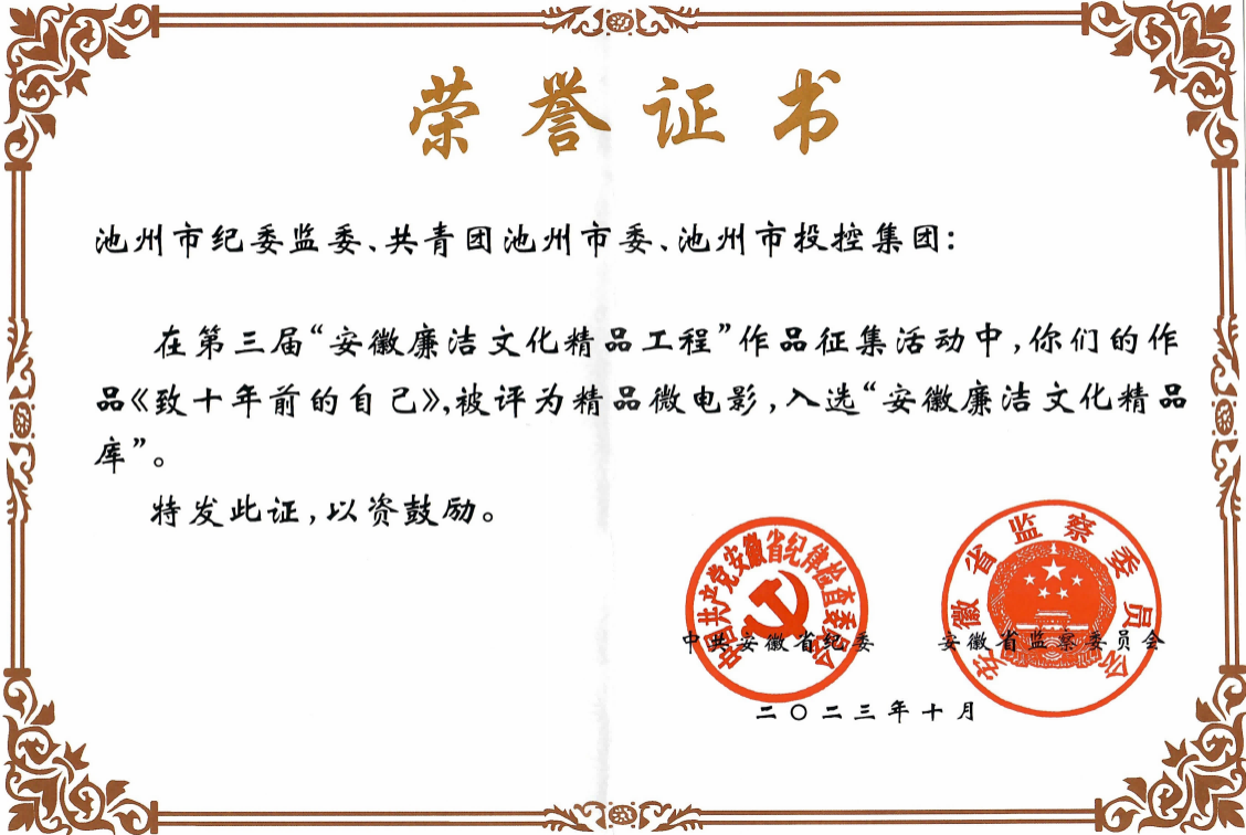 據(jù)悉,在第三屆“安徽廉潔文化精品工程”作品征集活動中,池州市紀委監(jiān)委、共青團池州市委、池州市投控集團聯(lián)合攝制的廉潔微電影《致十年前的自己》,被評為精品微電影,入選“安徽廉潔文化精品庫”。
