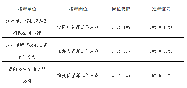 根據(jù)《池州市投資控股集團(tuán)2025年公開(kāi)招聘工作人員公告》要求,由于入圍體檢的考生中有部分人員自動(dòng)放棄或不合格產(chǎn)生了人員空缺。現(xiàn)按《公告》要求,視崗位情況進(jìn)行遞補(bǔ)?,F(xiàn)將入圍遞補(bǔ)體檢情況公告如下: