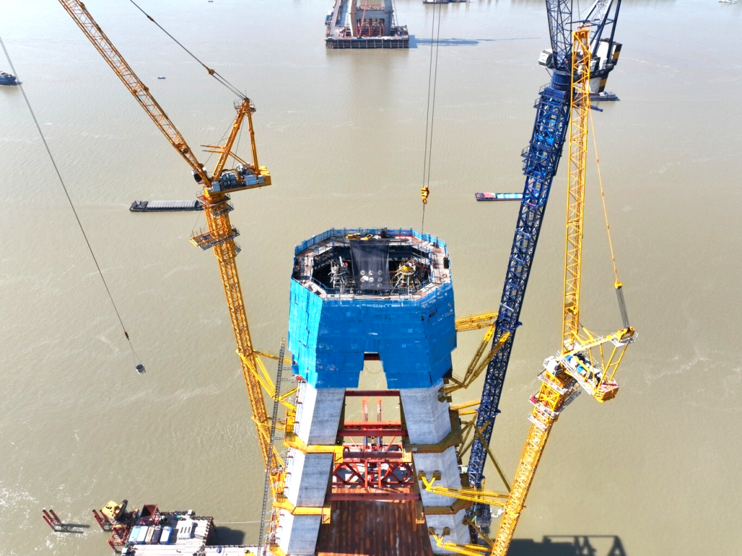 據(jù)悉,此次合龍段為4號主塔第31節(jié)段,分節(jié)高度4米,采用C60高標(biāo)號混凝土澆筑。該節(jié)塔柱澆筑完成后,主塔高度已達(dá)到177.05米,相當(dāng)于近60層樓高。作為支撐“跨江巨龍”屹立不倒的重中之重,主塔以其工藝精、要求高、標(biāo)準(zhǔn)嚴(yán)著稱,因而也是全橋施工的核心關(guān)鍵所在。