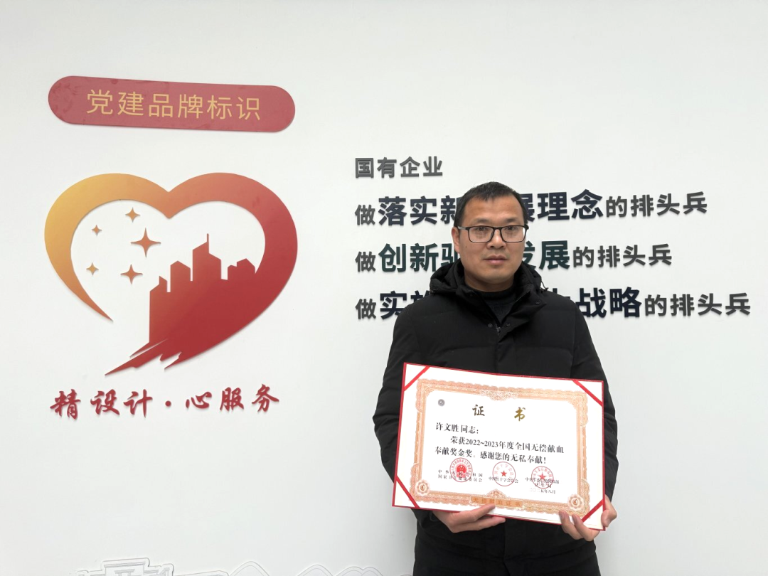 近日,集團(tuán)所屬設(shè)計(jì)總院員工許文勝同志榮獲由國家衛(wèi)生健康委員會、中國紅十字會總會、中央軍委后勤保障部衛(wèi)生局頒發(fā)的“2022—2023年度全國無償獻(xiàn)血獎金獎”,以表彰他二十年如一日的無償奉獻(xiàn)。