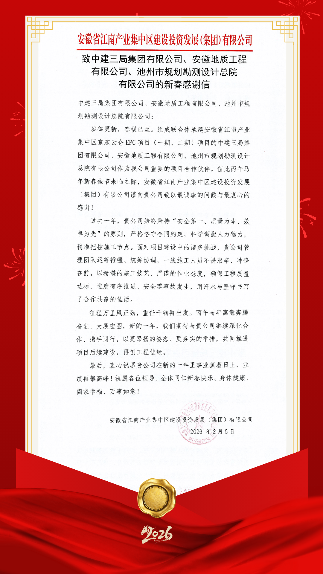 歲末傳捷報,新春啟佳音。近日,由集團(tuán)旗下安徽地質(zhì)工程有限公司、池州市規(guī)劃勘測設(shè)計總院有限公司與中建三局集團(tuán)有限公司組成的聯(lián)合體,在安徽省江南產(chǎn)業(yè)集中區(qū)京東云倉EPC項目(一期、二期)建設(shè)中,以“安全零事故、質(zhì)量全達(dá)標(biāo)、進(jìn)度穩(wěn)推進(jìn)”的優(yōu)異成績,圓滿達(dá)成年度建設(shè)目標(biāo),贏得項目業(yè)主安徽省江南產(chǎn)業(yè)集中區(qū)建設(shè)投資發(fā)展(集團(tuán))有限公司的高度認(rèn)可與新春致謝。