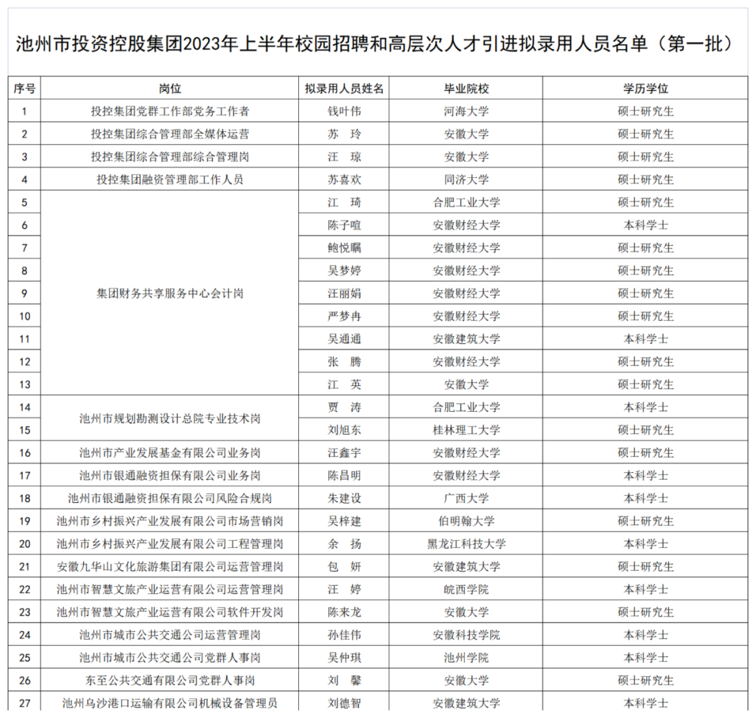 附件:池州市投資控股集團(tuán)2023年上半年校園招聘和高層次人才引進(jìn)擬錄用人員名單(第一批)