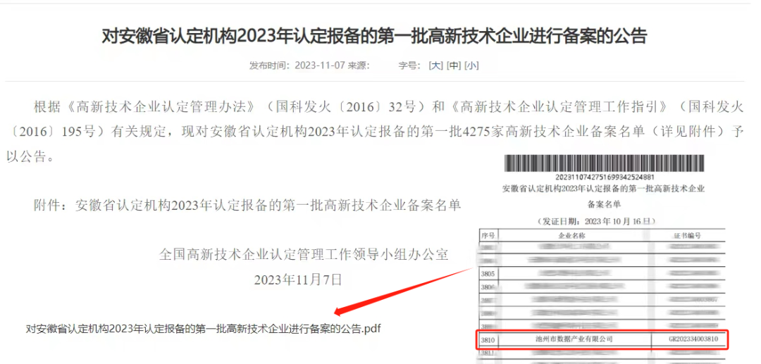11月7日,全國高新技術(shù)企業(yè)認(rèn)定管理工作領(lǐng)導(dǎo)小組辦公室發(fā)布《對安徽省認(rèn)定機(jī)構(gòu)2023年認(rèn)定報(bào)備的第一批高新技術(shù)企業(yè)進(jìn)行備案的公告》,池州市數(shù)據(jù)產(chǎn)業(yè)有限公司名列其中,榮獲2023年度第一批認(rèn)定的高新技術(shù)企業(yè)。