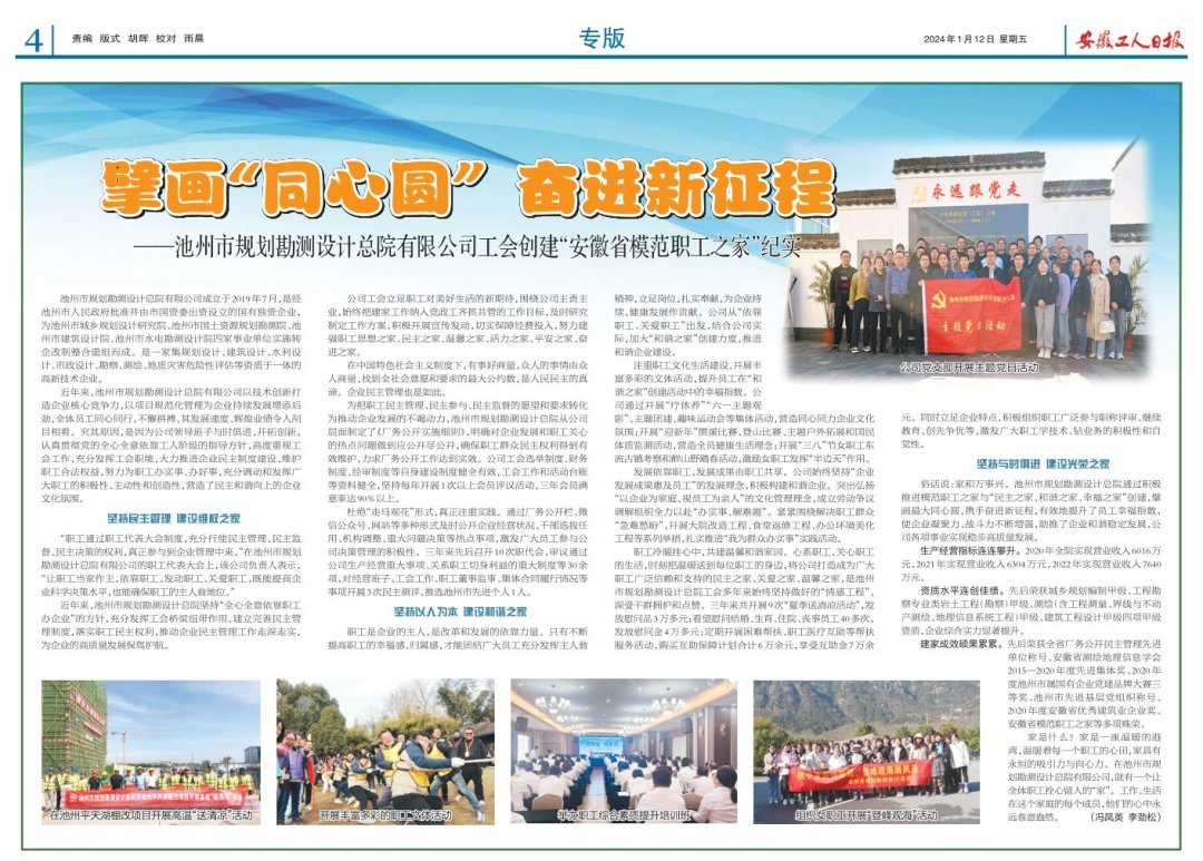 近日,安徽省總工會(huì)發(fā)布《關(guān)于命名安徽省模范職工之家、安徽省模范職工小家和安徽省優(yōu)秀工會(huì)工作者的決定》,集團(tuán)下屬設(shè)計(jì)總院榜上有名,榮獲“安徽省模范職工之家”榮譽(yù)稱號(hào)。今日,《安徽工人日?qǐng)?bào)》對(duì)設(shè)計(jì)總院職工之家創(chuàng)建進(jìn)行了報(bào)道以下為報(bào)道全文