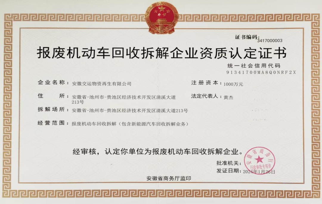 近日,集團所屬安徽交運物資再生有限公司順利通過安徽省商務廳批準,成功獲得報廢機動車回收拆解企業(yè)資質認定證書 。