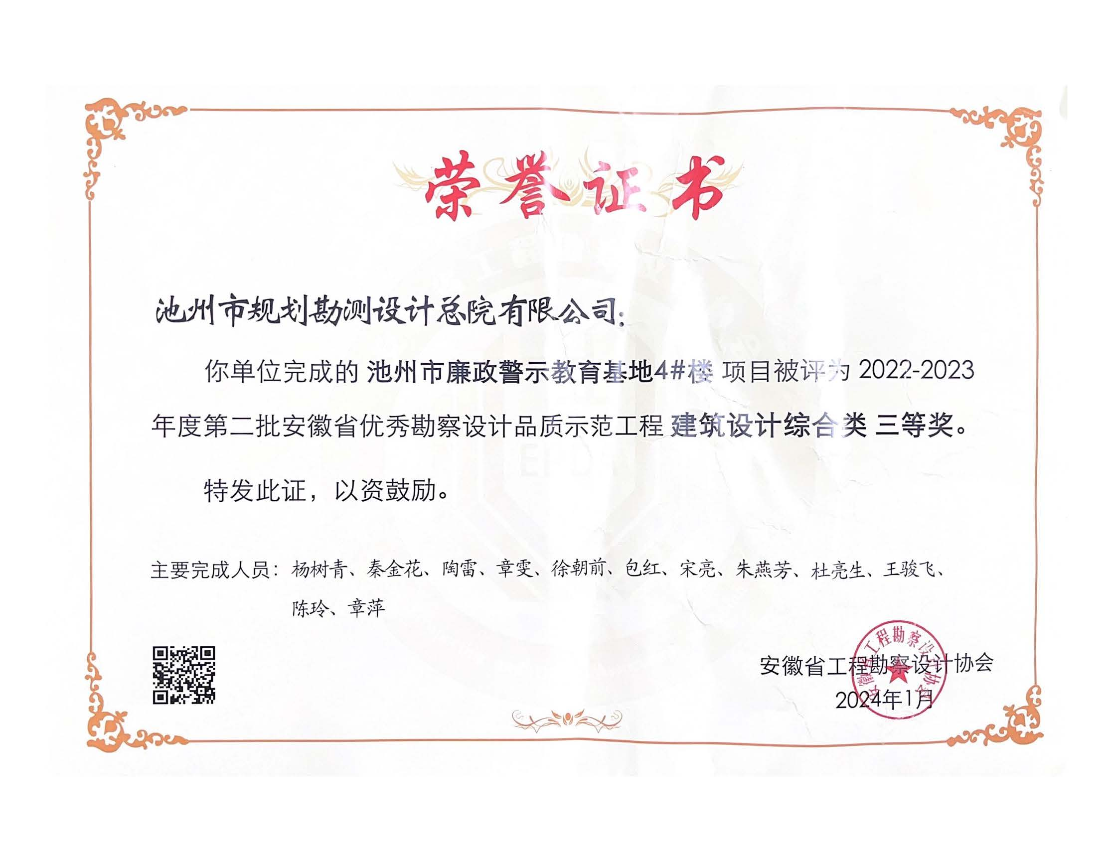 近日,2022-2023年度第二批安徽省優(yōu)秀勘察設計品質示范工程名單公布,池州市規(guī)劃勘測設計總院有限公司憑借“池州市廉政警示教育基地4#樓設計項目”榮獲建筑設計綜合類三等獎。
