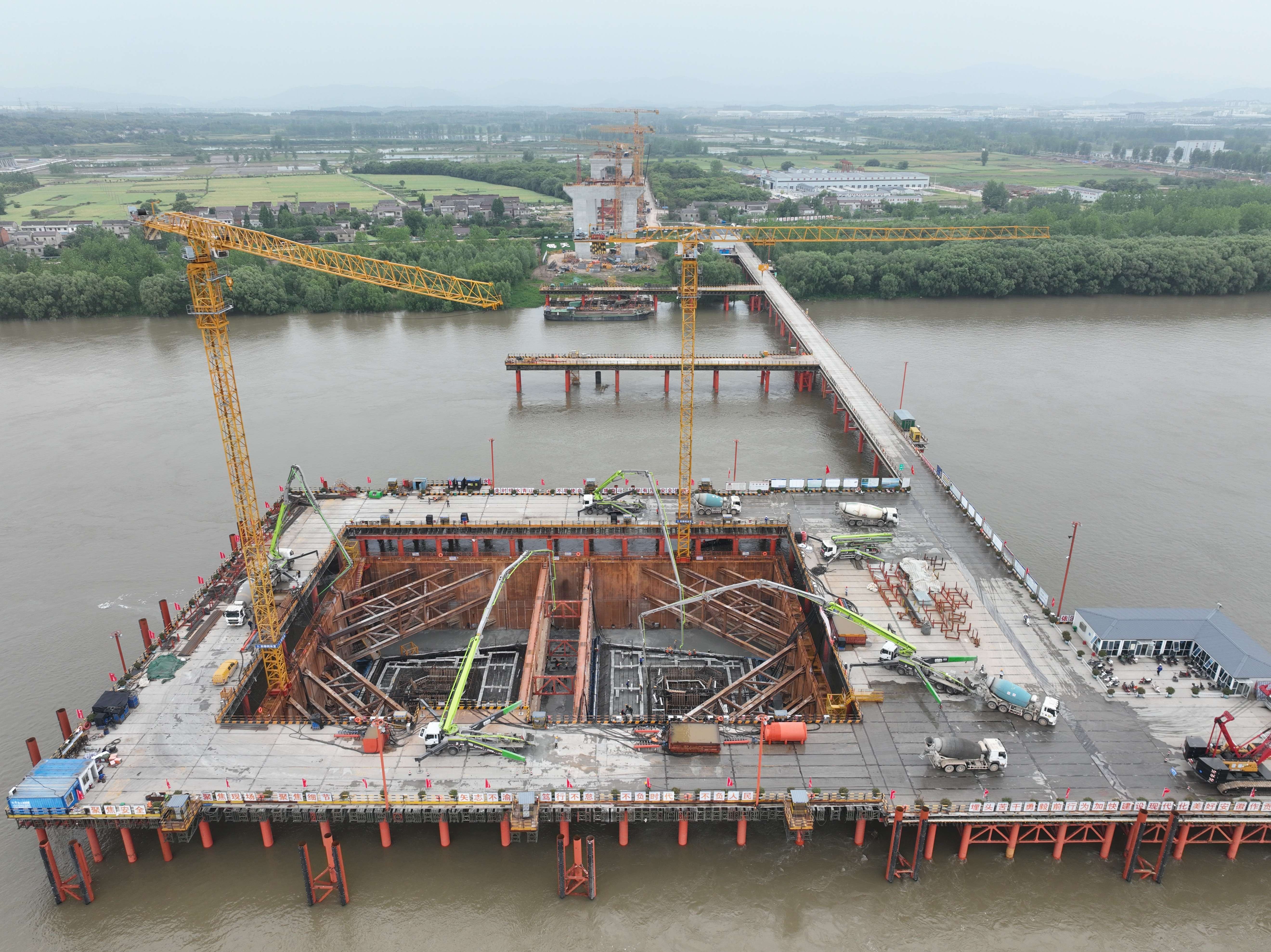 截至目前,池州長(zhǎng)江公鐵大橋主橋4號(hào)墩承臺(tái)第一層施工完成,5號(hào)墩鐵路墩身已施工完成,6號(hào)墩目前在進(jìn)行鐵路墩蓋梁施工。引橋完成10個(gè)承臺(tái)施工,S4號(hào)墩和S5號(hào)墩鐵路墩身已施工完成,8個(gè)鐵路墩身正在進(jìn)行施工。